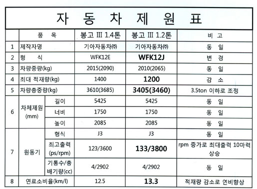 이 때문에 기아자동차에서는 동일한 차량(외관, 엔진, 미션등까지도)을 1.4톤에서 1.2톤으로 명칭만 변경하여